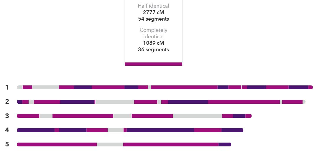 and if both match, then we are fully or completely identical in that region. The DNA comparison graph shows how this looks with me and my brother. Gray areas are